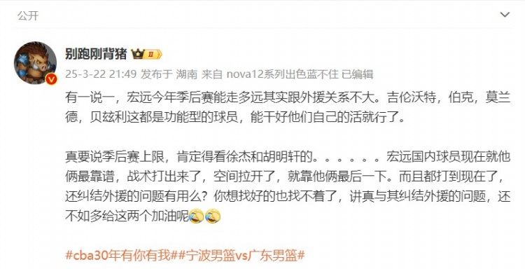@别跑刚背猪 在个人微博上写道:“有一说一,宏远今年季后赛能走多远其实跟外援关系不大。吉伦沃特,伯克,莫兰德,贝玆利这都是功能型的球员,能干好他们自己的活就行了。