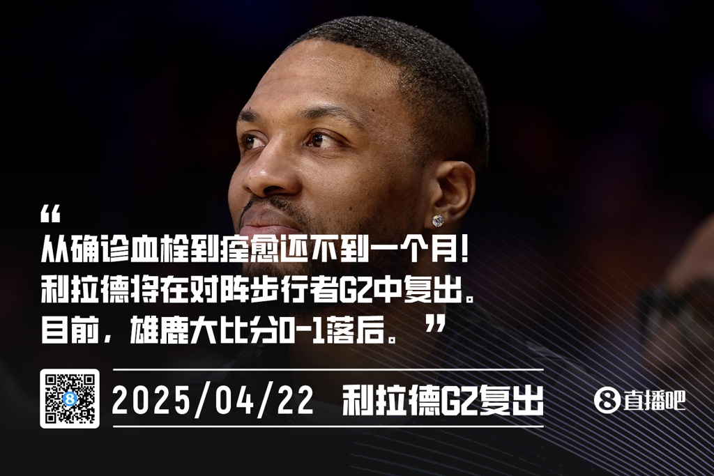 04月22日讯 据Shams等多位记者报道,雄鹿后场核心利拉德表示自己将在明日(23日上午7点)对阵步行者的G2中复出。随后,雄鹿官方确认了利拉德已经升级为可以出战。目前,雄鹿系列赛大比分0-1落后于步行者。