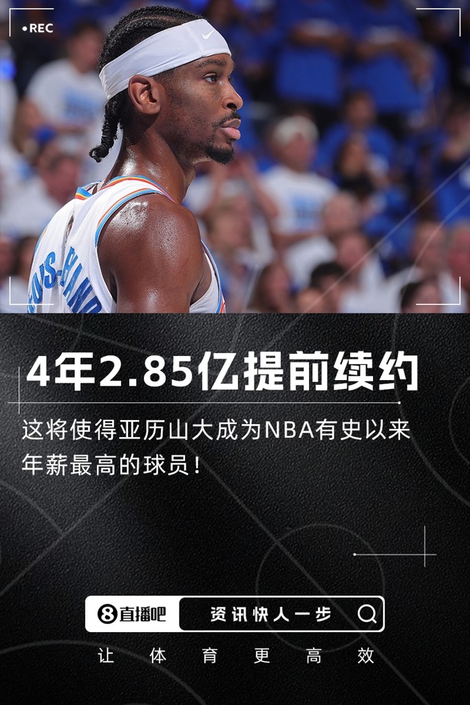 07月01日讯 Shams报道,亚历山大与雷霆达成超级顶薪的提前续约,合同为4年2.85亿美元,这将使他成为NBA历史上年薪最高的球员!