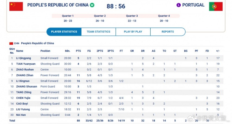 球员数据方面,五名球员得分上双,前半场状态火热的陈玉婕取得19分4板4助,李星诺16分2断,唐子婷11分9板2助,张梓涵11分6板2助,刘禹彤11分。葡萄牙队只有两名队员得分上双,伊内斯-拉莫斯14分,伊娃-卡雷戈萨12分。