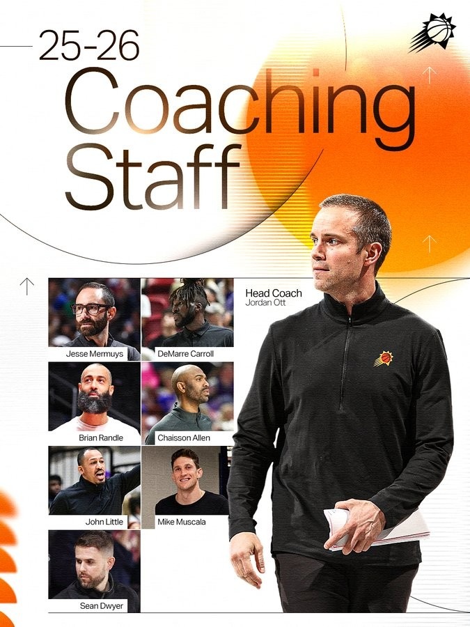 8月13日讯 太阳官方公布了25-26赛季球队教练组的全部人员名单,具体如下: