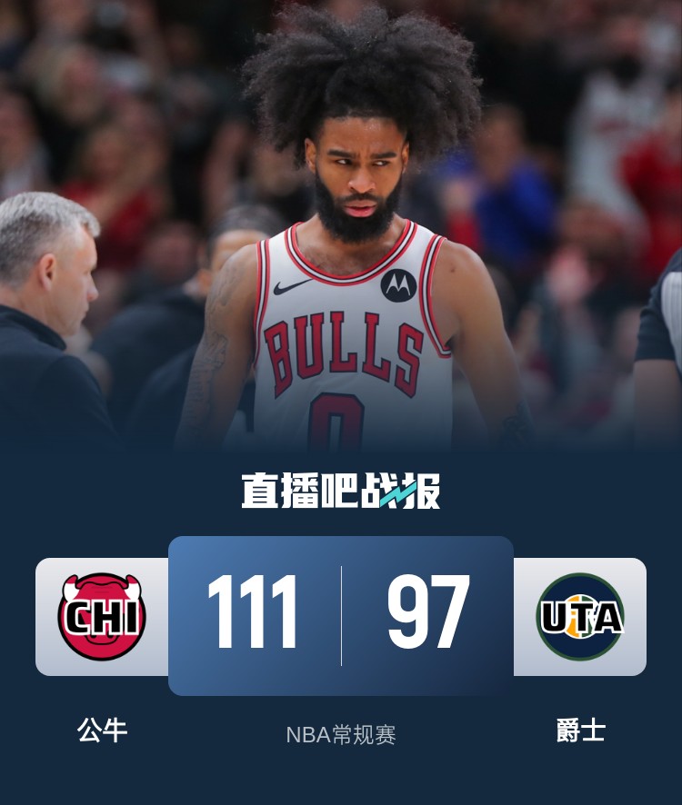 开场后公牛多点开花以10-0开局,爵士连续进攻内线得手缩小分差,不过公牛又是打出一波攻势将分差拉大到两位数。第二节上来爵士内外开花一波14-2的攻势完成反超,随后两队陷入拉锯战,依靠琼斯的一记三分,公牛上半场领先1分。易边再战,布泽利斯和琼斯联手打出一波小高潮帮助公牛再度领先,爵士外线手感不佳还是依靠冲击内线追分,公牛在进攻端表现稳定,场上分差一直维持在两位数,第四节爵士一度掀起反扑追到只差4分,但接下来爵士进攻突然断电,公牛回应12-0的攻势再度将比分拉开,最终公牛111-97送给爵士10连败。