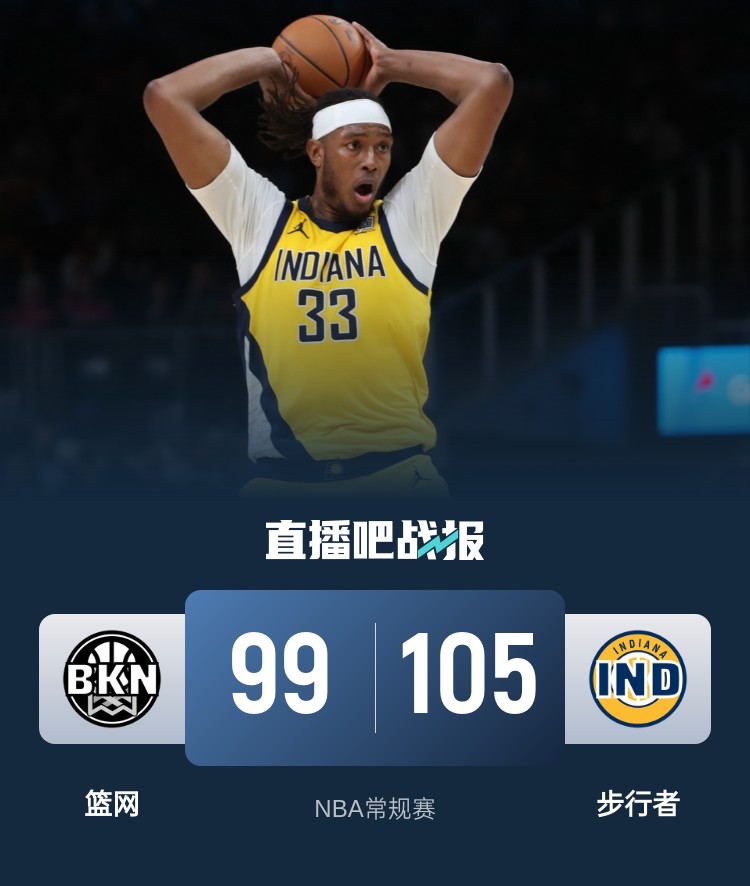 比赛开始,双方上来都比较慢热,打了半节都没有得分上双。内史密斯三分命中后扎威三分回应,沃特福德里突外投连砍5分助篮网首节领先5分,次节步行者进攻端还是不佳,篮网一度拉开双位数领先,沃克里突外投连砍8分咬住比分,但拉塞尔连续三分回应半场保持10分领先。下半场,特纳里突外投连砍8分,步行者全民皆兵一度追到差1分,夏普连续前场板回应7-0止血,三节篮网领先6分,末节沃特福德与特纳、内姆哈德冲突连吃两T被驱逐,步行者顺势追平比分,比赛进入白热化,扎威关键三分领先到5分,马瑟林再追2分后三分被犯规且三罚全中拖入加时。加时赛,内姆哈德再吃T也被驱逐,双方比分始终胶着,特纳关键血帽,内史密斯两罚全中杀死比赛,最终步行者加时105-99险胜篮网,拿到3连胜。