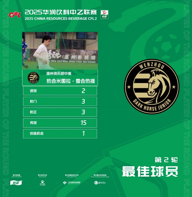 4月3日讯 中乙联赛官方公布了第2轮最佳球员,为温州俱乐部中胤梅开二度的热合米图拉-雪合热提当选。