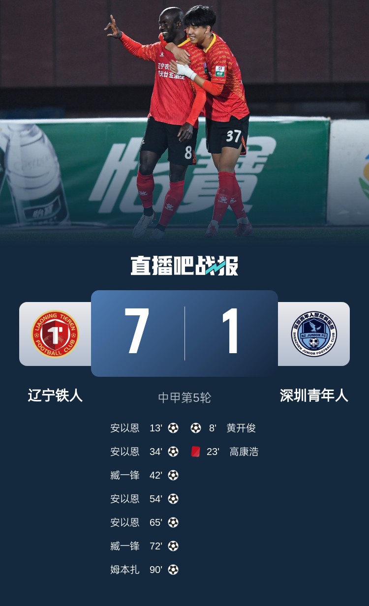 北京时间4月22日晚上19:00,中甲第5轮,辽宁铁人坐镇沈阳城市体育场迎战深圳青年人。上半场,黄开俊破门,安以恩扳平,高康浩直红,安以恩梅开二度,臧一锋再下一城。下半场,安以恩连进两球完成大四喜,臧一锋双响,姆本扎锦上添花。全场结束,辽宁铁人7-1深圳青年人。本场过后,辽宁铁人4胜1负积12分,深圳青年人2胜3负积6分。