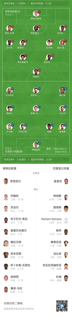 斯特拉斯堡首发:1-佩特洛维奇、22-盖拉-杜埃、29-伊斯梅尔-杜库雷、23-马马杜-萨尔、8-桑托斯、32-瓦伦丁-巴尔科、6-莱马雷查尔、19-哈比卜-迪亚拉、26-巴卡瓦、7-迭戈-莫雷拉、10-埃梅加