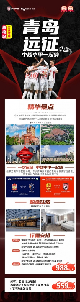 为让球迷畅享“一次远征,中超中甲双赛同观”的体验,同时领略青岛绿树红瓦、碧海蓝天的滨海风情,陕西联合足球俱乐部与顶级企业会员「乐游旅游」联合重磅推出【青岛远征观赛团】!本次活动由「乐游旅游」全程策划执行,现面向广大球迷火热招募,详情如下: