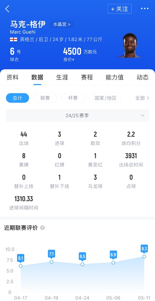 格伊已为英格兰国家队出场23次,并肯定将入选明年世界杯的阵容名单。上赛季,他为水晶宫出场44场,取得3粒进球和2次助攻,目前其德转身价为4500万欧元。
