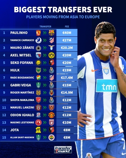 06月28日讯 德转盘点了足坛最贵的几笔从亚洲到欧洲的球员转会,前广州恒大中场保利尼奥4000万欧转投巴萨占据榜单第一。