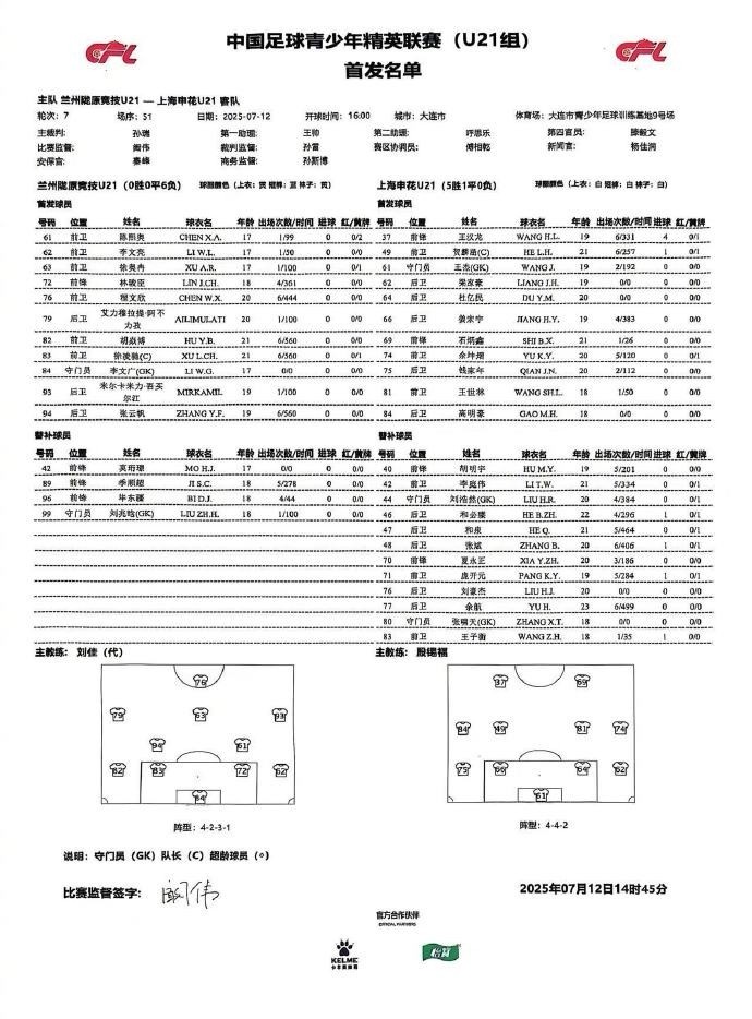7月12日16:00 ,2025中国足球青少年精英联赛(U21组)第7轮上海申花对阵兰州陇原竞技的比赛在大连青少年足球训练基地进行。比赛第4分钟,石炳鑫帮助申花首开纪录。随后王汉龙在比赛第19分钟、33分钟、40分钟、59分钟连入四球完成大四喜。第77分钟,王子衡破门,6-0。高明豪在第78、79分钟连入两球。第84分钟,胡明宇打入一球。第89分钟,王子衡再度得分,完成梅开二度。最终,上海申花10-0战胜兰州陇原竞技。7月15日16:00,申花将在大连普湾体育场外场迎战第8轮对手青岛海牛。