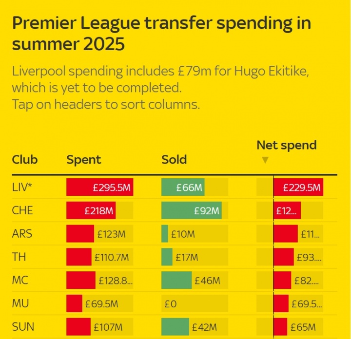 据天空体育统计,利物浦今夏净支出(总支出减去卖人所得)也已经达到2.295亿英镑,遥遥领先排名第二的切尔西,甚至高于曼城与阿森纳支出总和。
