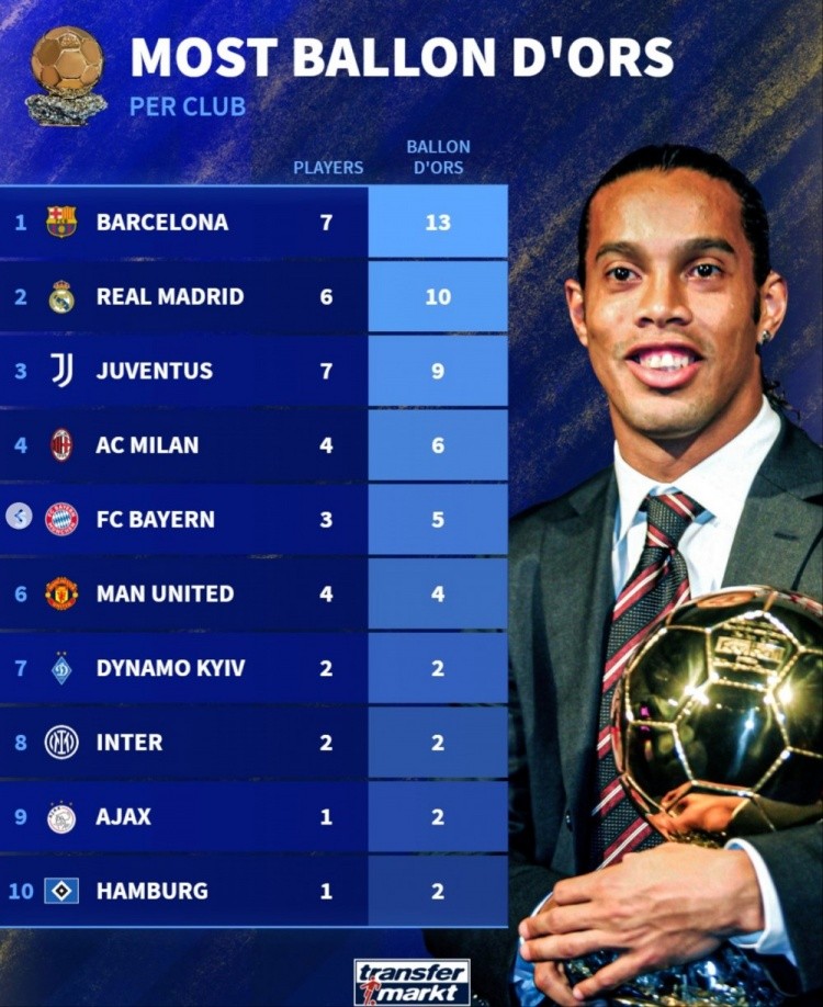 9月22日讯 德国转会市场统计了各个俱乐部和球员赢得金球奖的次数,并列出榜单。其中巴萨7人13次居首,皇马6人10次第二,尤文图斯7人9次排名第三。